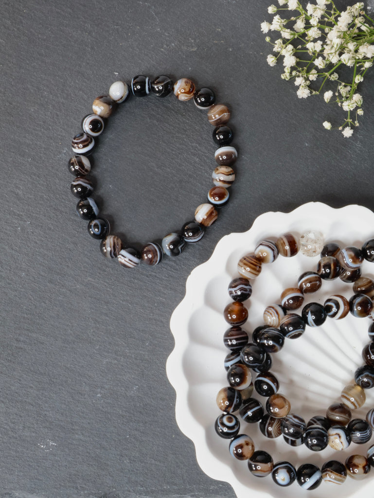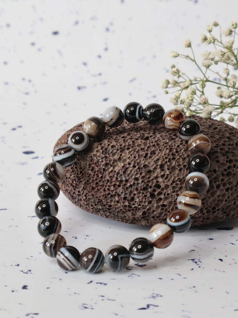 Wrap yourself in powerful protection. This Sulemani Hakik bracelet carries deep black, grey and earthy banded patterns that have been revered for centuries for their strong shielding energy. Known as one of the most powerful protective stones, Sulemani Hakik is believed to guard against negativity, evil eye and unwanted influences while grounding your energy and strengthening emotional stability.